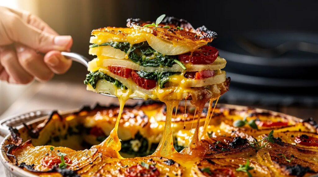 Diese Variante arbeitet mit Zutaten, die im März günstig und gut verfügbar sind: frischer Blattspinat, der gerade wieder auf den Märkten erscheint, reife Tomaten aus dem Treibhaus und festkochende Kartoffeln aus dem Winterlager. Das Besondere an dieser Rezeptur liegt in der präzisen Schichtführung, die verhindert, dass die einzelnen Elemente zu einer formlosen Masse verschmelzen – jede Schicht bleibt erkennbar. Wer einmal versteht, wie der Aufbau funktioniert, hat ein Rezept für alle Jahreszeiten. Es ist Zeit, die Kastenform aus dem Schrank zu holen.